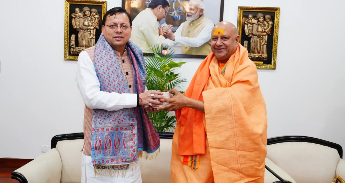धामी से मुख्यमंत्री आवास में महामंडलेश्वर स्वामी यतीन्द्रानंद गिरि महाराज ने शिष्टाचार भेंट की