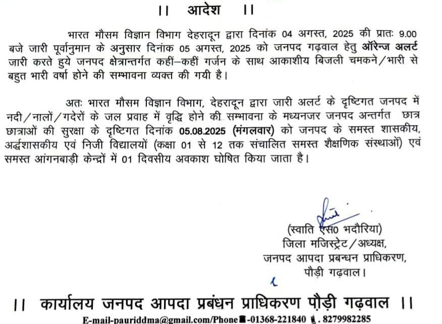 भारत मौसम विज्ञान केंद्र, देहरादून द्वारा पौड़ी जिले में भारी से बहुत भारी वर्षा की संभावना के दृष्टिगत 5 अगस्त अर्थात मंगलवार को जिले के समस्त विद्यालयों एवं आंगनबाड़ी केंद्रों में अवकाश घोषित।