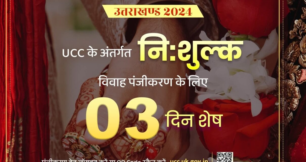 समान नागरिक संहिता (UCC) के अंतर्गत नि:शुल्क विवाह पंजीकरण के लिए मात्र 03 दिन शेष, शीघ्र कराएं विवाह पंजीकरण।