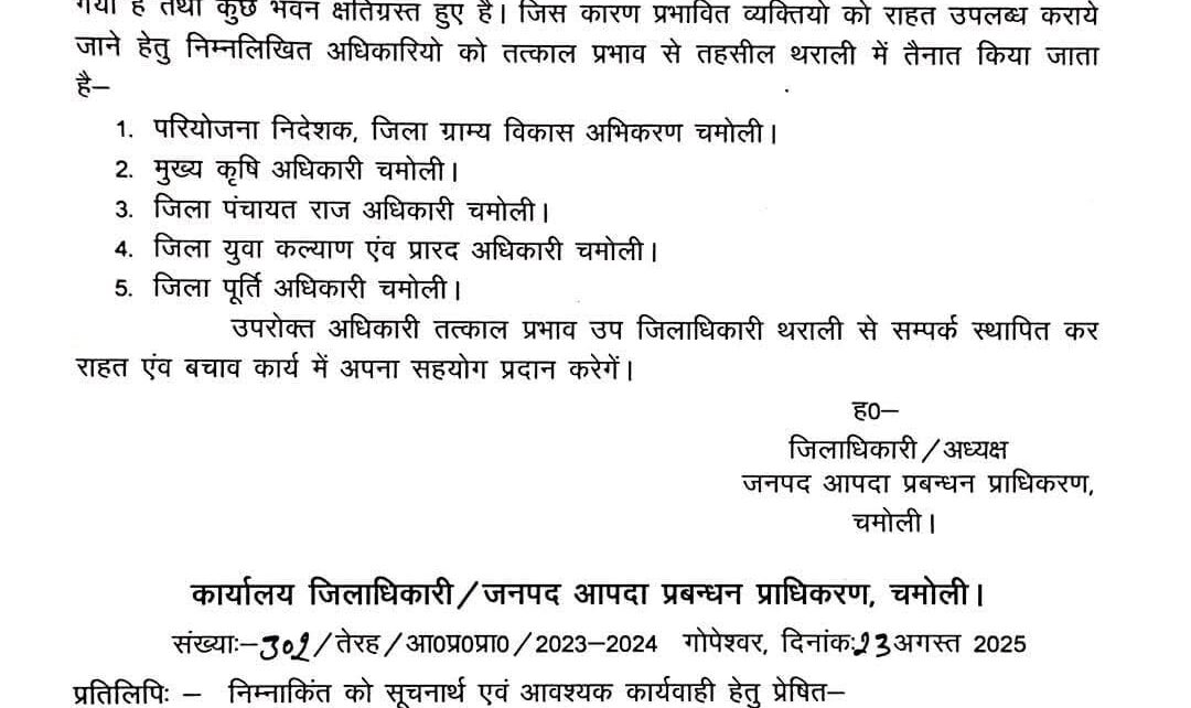 जिलाधिकारी, चमोली ने तहसील थराली में हुई अतिवृष्टि के कारण प्रभावितों को राहत उपलब्ध कराये जाने हेतु निम्न अधिकारियों को तत्काल प्रभाव से तहसील थराली में तैनाती के आदेश दिए हैं।